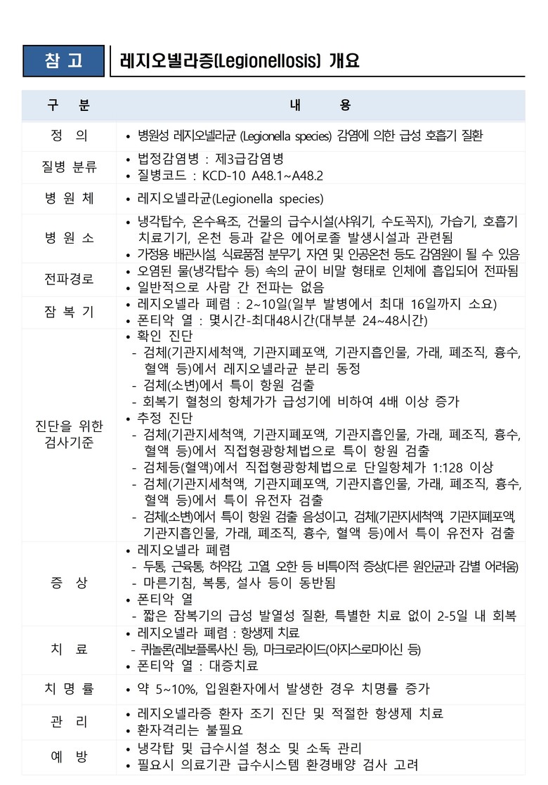 레지오넬라증은 제3급 법정 감염병으로, 오염된 물에서 증식한 레지오넬라균이 에어로졸 형태로 흡입돼 폐렴·독감을 일으킨다. 대형건물의 냉각탑‧급수시설 등에서 주로 발생하고, 냉방기 사용이 급증하는 하절기에 환자 발생이 집중된다.