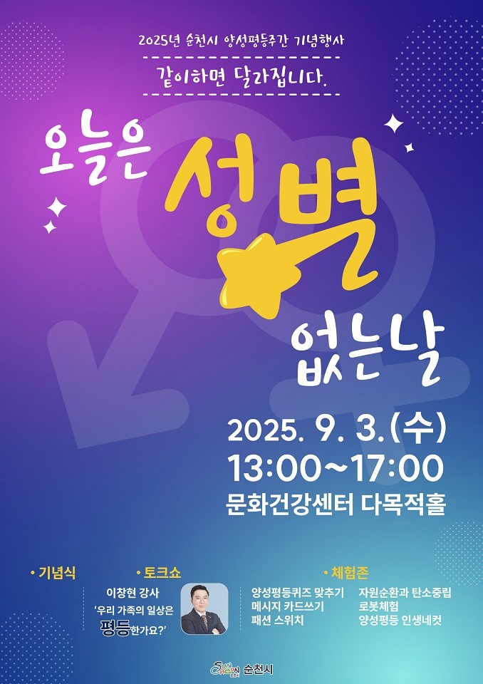 시 관계자는 “이번 행사는 성별 고정관념을 넘어, 가족과 지역사회에서 평등한 일상을 함께 만들어가자는 메시지를 담고 있다”며 “시민 여러분의 많은 참여를 통해 순천이 더 따뜻하고 평등한 도시로 자리매김하길 기대한다”고 전했다.
