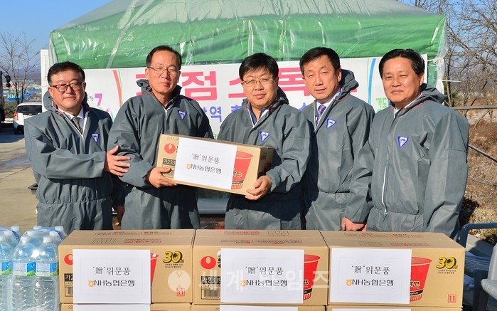 AI피해 현황 보고가 끝나고 이 행장은 양주시 거점소독시설을 방문하여 직접 진입 차량에 소독을 실시하고 현장에서 고생하고 있는 방역담당자들에게 위문품을 전달하였다.