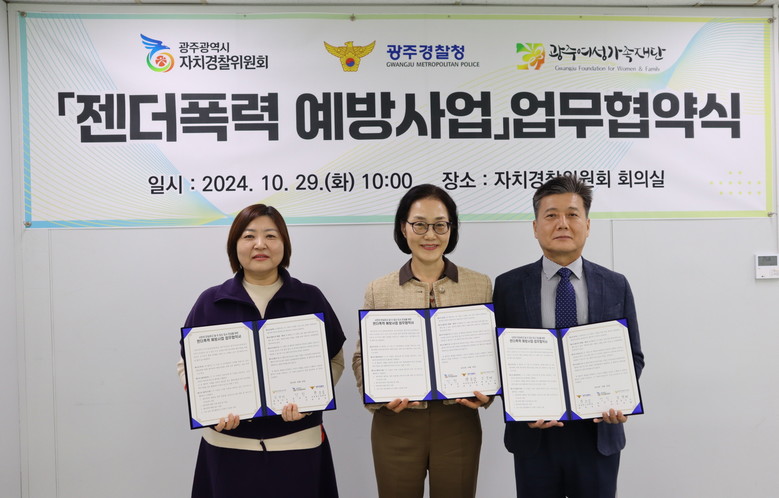 이날 협약식에는 안진 광주자치경찰위원장, 박종삼 광주경찰청 여성청소년과장, 김경례 광주여성가족재단 대표이사 등이 참석했으며, 이들은 젠더폭력 예방과 피해 지원에 힘을 모으기로 했다.