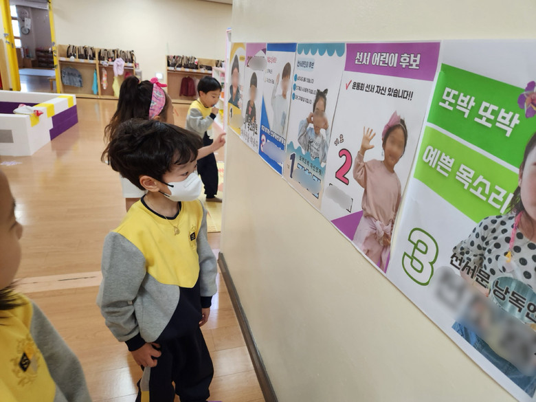 이에 투표 놀이에 앞서 ▲각 학급에서 지원 유아 모집하기 ▲각 학급에서 지원 유아 선서문 낭독하기 ▲우리 학급 후보 유아 2명 선출하기 ▲ 학급 후보 홍보하기(후보 유아 홍보 전단 활용) ▲5세 유아 전체 대상 학급 후보 유아 선서문 낭독하기 등 사전 활동이 진행되었다.