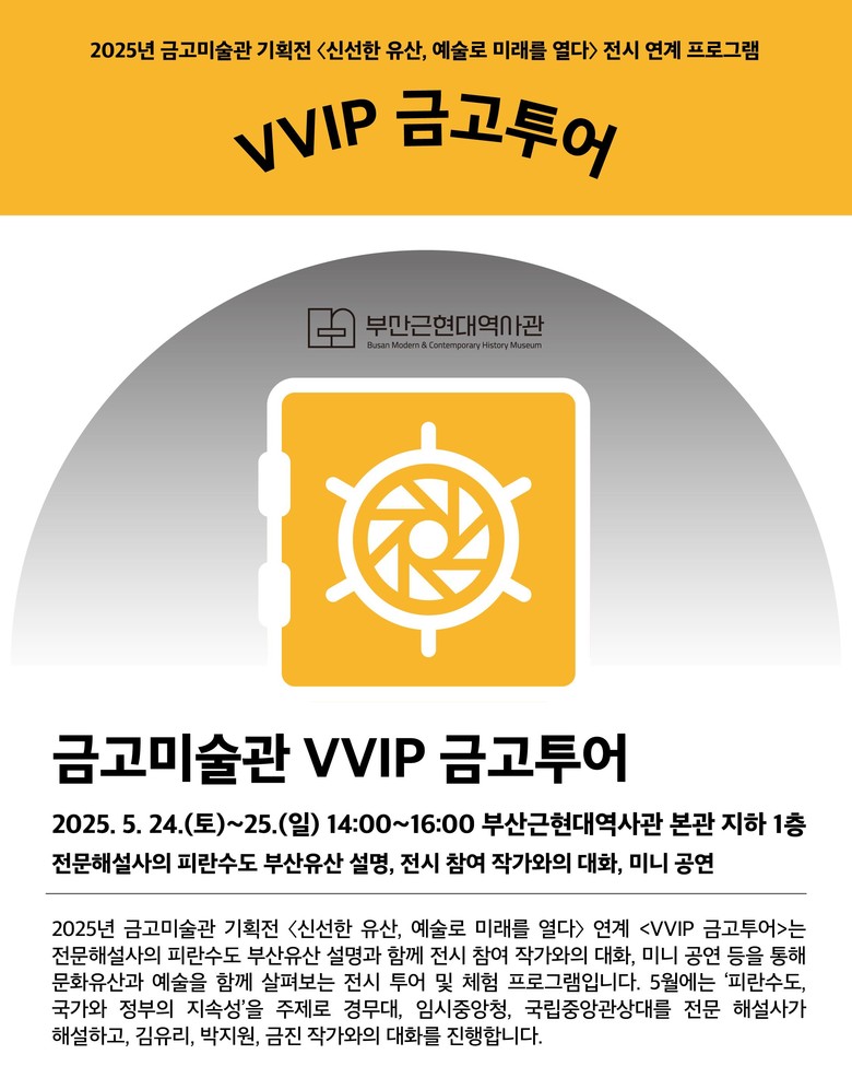 ◈ 5월부터 7월까지 총 9차례 걸쳐 ▲전문 해설사 설명 ▲전시 참여 작가와의 대화 ▲미니 공연 등 진행… 5.16.부터 역사관 누리집을 통해 선착순으로 사전 접수 [부산 세계타임즈=이용우 기자] 부산근현대역사관(이하 역사관)은 2025년 금고미술관 기획전 연계 프로그램으로 〈브이브이아이피(VVIP) 금고투어〉를 운영한다고 밝혔다.