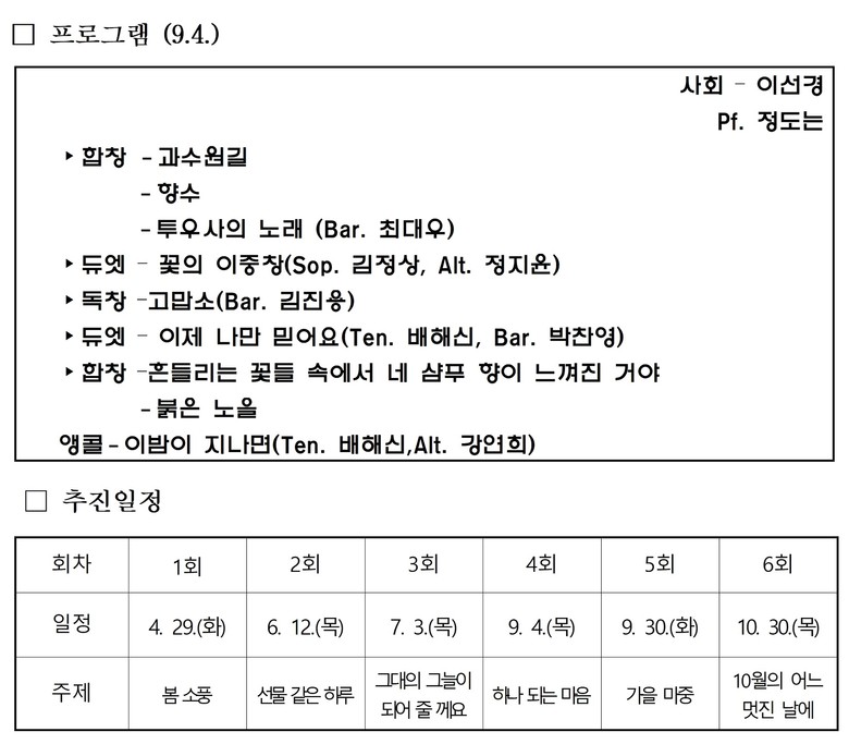 진행과 해설은 단원 이선경이 맡으며, 소프라노 김정상, 알토 강연희·정지윤, 테너 배해신, 베이스 김진용·최대우·박찬영 등이 무대에 올라 독창(솔로)과 이중창(듀엣), 합창으로 풍성한 무대를 선보인다.