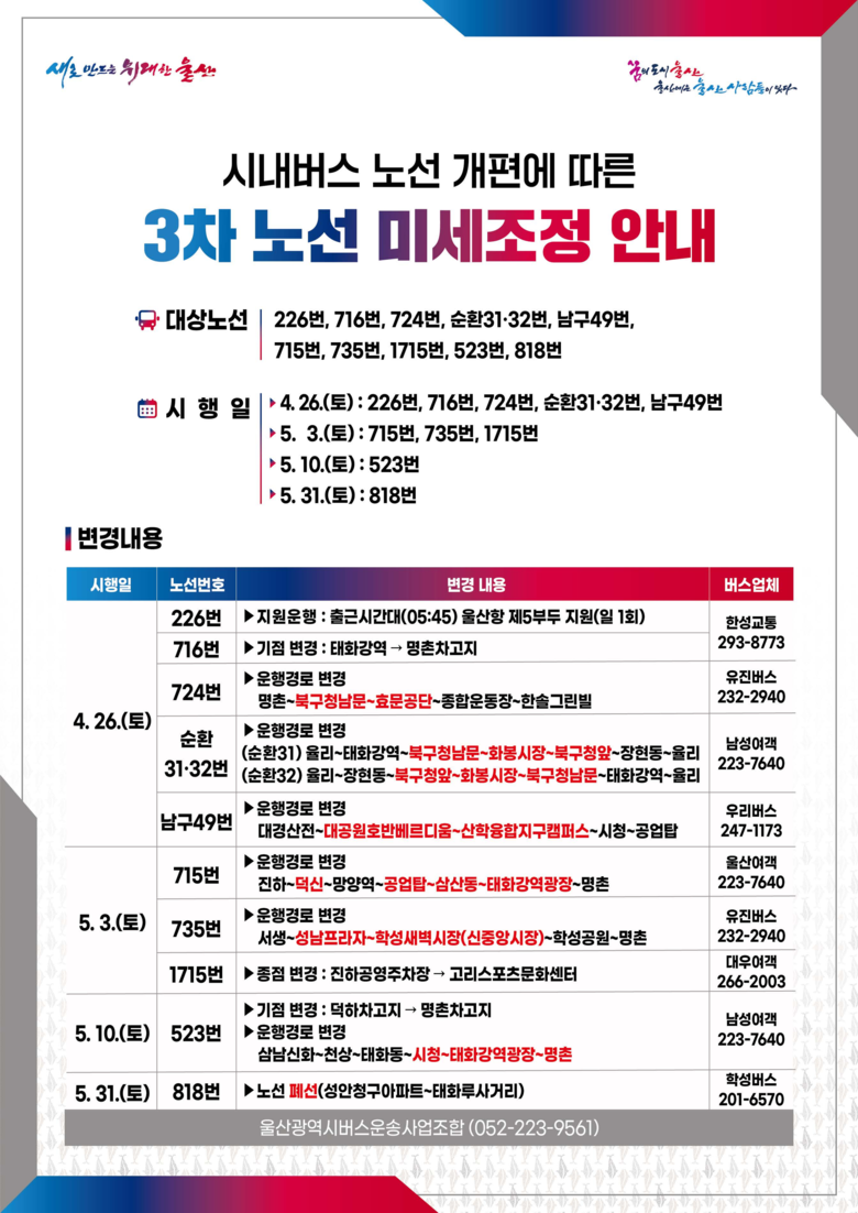 한편 울산시는 지난 3월 1일에 동구.북구.울주군 지역의 학생 등교 편의와 주민 불편의 해소를 위해 5개 노선을, 3월 29일과 4월 5일에는 4개 노선을 미세조정한 바 있다.
