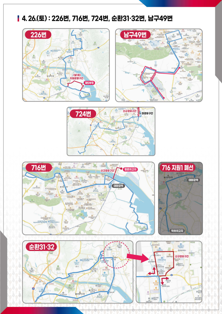 오는 4월 26일(토)부터 순환 31.32번, 226번, 716번, 724번, 남구49번 등 5개 노선이 조정된다.