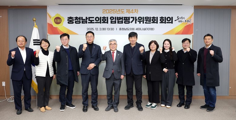 [충남 세계타임즈=이현진 기자] 충남도의회는 2일 의회 세미나실에서 ‘2025년도 제4차 충청남도의회 입법평가위원회 회의’를 열고, 입법평가 연구용역 최종 보고와 함께 향후 조례 개선 방향, 「지방의회법」 등 자치분권 법제 개선 방향 등을 공유했다.