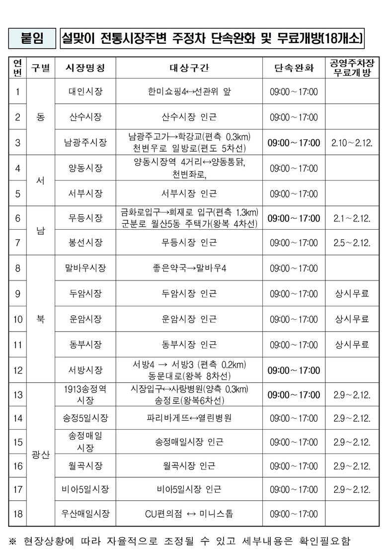 불법주정차 단속 완화 전통시장은 ▲동구 대인시장, 산수시장, 남광주시장 ▲서구 양동시장, 서부시장(화정동) ▲남구 무등시장, 봉선시장 ▲북구 서방시장, 두암시장, 운암시장, 말바우시장, 동부시장(중흥동) ▲광산구 1913송정역시장, 송정매일시장, 송정5일시장, 비아5일시장, 월곡시장, 우산매일시장 등 18곳이다.