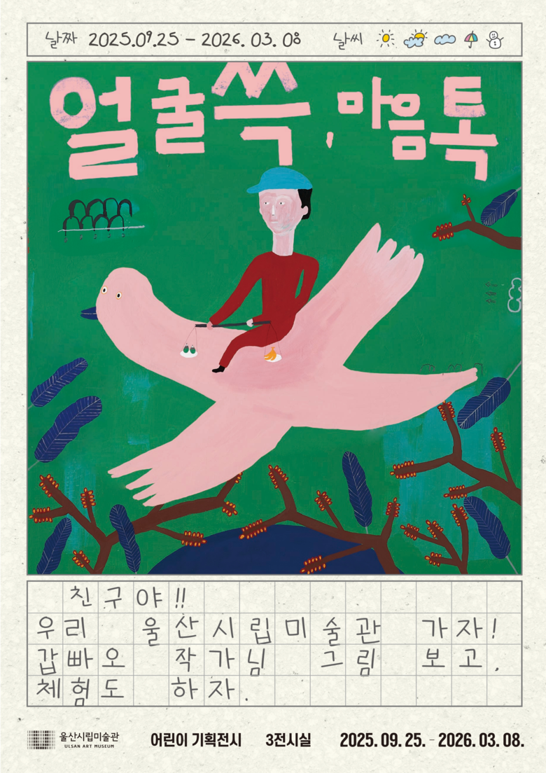 갑빠오 작가의 회화, 도자기 등 130여 점 전시 [울산 세계타임즈=이호근 기자] 울산시립미술관은 오는 9월 25일부터 내년 3월 8일까지 1층 3전시실과 로비에서 어린이전시 ‘얼굴 쓱, 마음 톡’을 연다고 밝혔다.