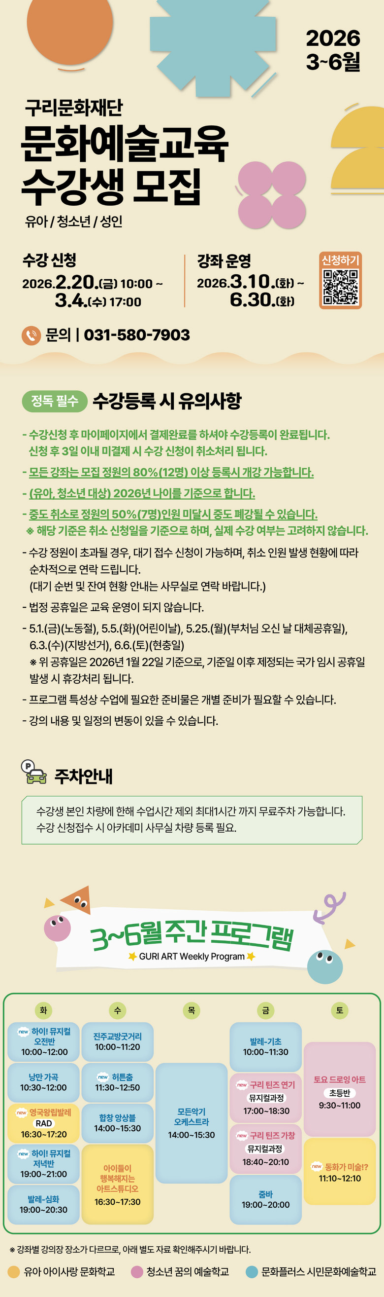 창의적인 예술 경험과 시민 문화 향유 기회 확대 [구리시 세계타임즈=송민수 기자] (재)구리문화재단(이사장 백경현)은 2026년 문화예술교육 상반기 강좌 수강 신청을 2월 20일(금)부터 선착순으로 접수한다고 밝혔다.