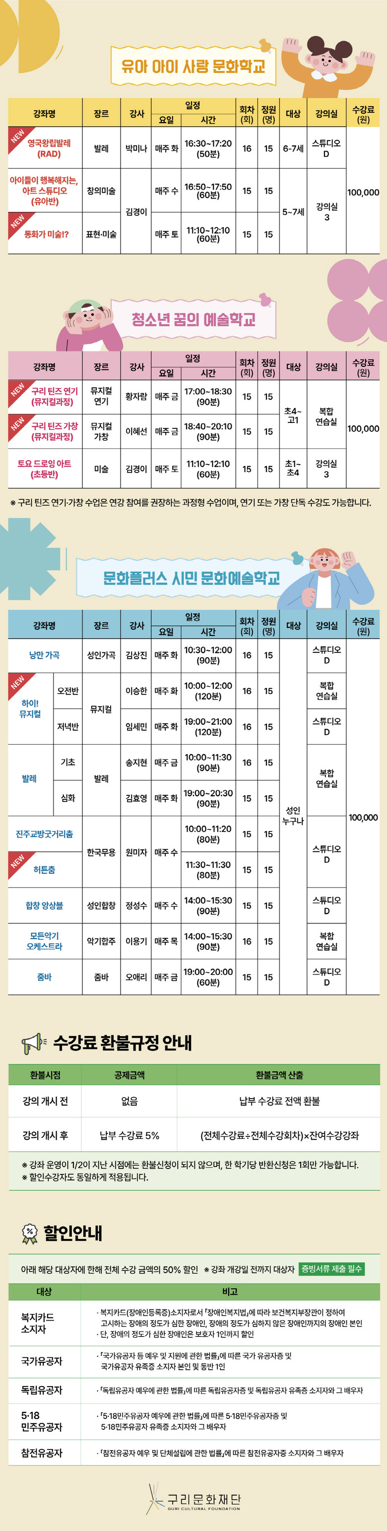 청소년 과정은 뮤지컬 전문 교육을 강화했다. ‘구리 틴즈 연기’와 ‘구리 틴즈 가창’은 무대 표현력과 발성 훈련을 체계적으로 배우는 뮤지컬 교육 과정으로, 실전 중심 교육이 특징이다. 또한 ‘토요 드로잉 아트’는 이야기 기반의 미술 융합 수업으로 창의적 사고와 표현력을 확장한다.