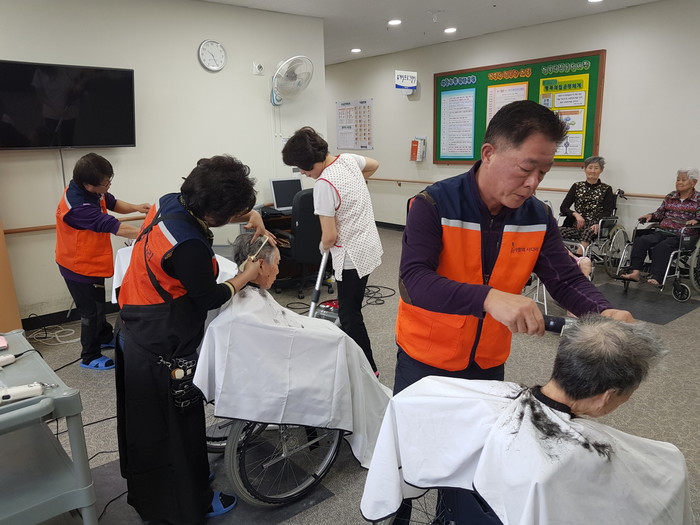 이날 미용봉사에는 권순분, 추병희 모녀 회원들과 송남석, 정영산, 조은숙 회원들이 3층과 4층에서 미용봉사를 하였다.