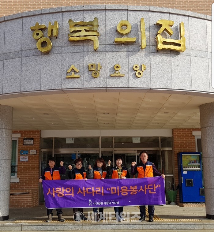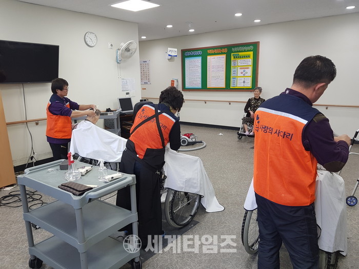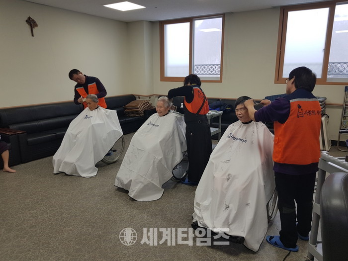 [대전=세계타임즈 이장성 기자] 회원 6천명이 활동하고 있는 사랑의 사다리 밴드(리더 이정제)는 11일 오전10시,충북 청주시 현도면에 위치한 꽃동네 소망요양원에서 치매와 와상 어르신들 50여분께 추운날씨에도 미용봉사로 사회적 효행을 실천하였다.