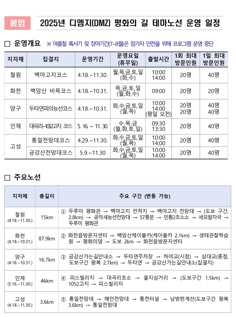 ‘디엠지(DMZ) 평화의 길’을 중심으로 주변 관광지를 연계한 ‘2025 평화공감 디엠지(DMZ) 힐링여행’도 9월부터 11월말까지 총 11회에 걸쳐 진행된다.