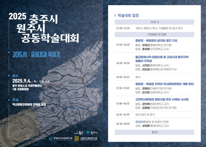 학술대회 일정은 ▲중원경ㆍ북원경의 설치와 공간 구성(최경선 충북대학교 연구원), ▲불교문화사적 관점으로 본 고려시대 충주지역 철불의 지역성(서지민 충북대학교 교수), ▲중원경ㆍ북원경 지역의 콘텐츠 개발 방안(장충희 전북연구원 연구원), ▲고대역사문화권 정비사업 추진 사례와 시사점(강인애, 원광대학교 교수) 순으로 발표가 진행된 후 종합 토론으로 이어진다.