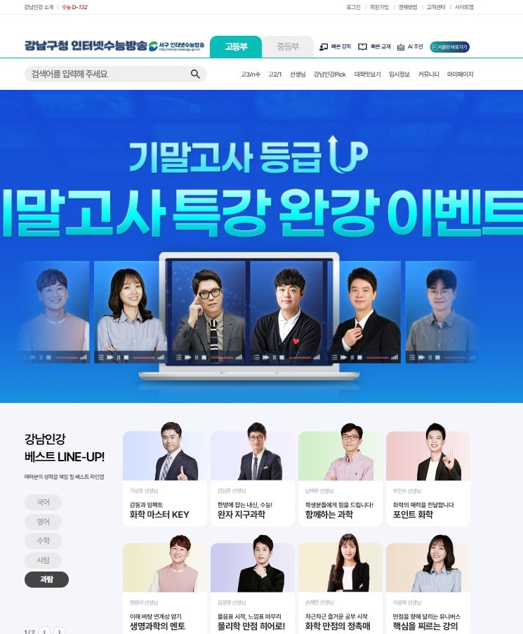 ‘강남인강’에서는 중등부 내신 강의부터 고등부 수능 준비까지 단계별, 수준별 인터넷 강의를 지원하고 있으며, 유명 현직 교사와 EBS 수능 스타강사 등 실력파 강사들이 직접 강의를 진행한다.