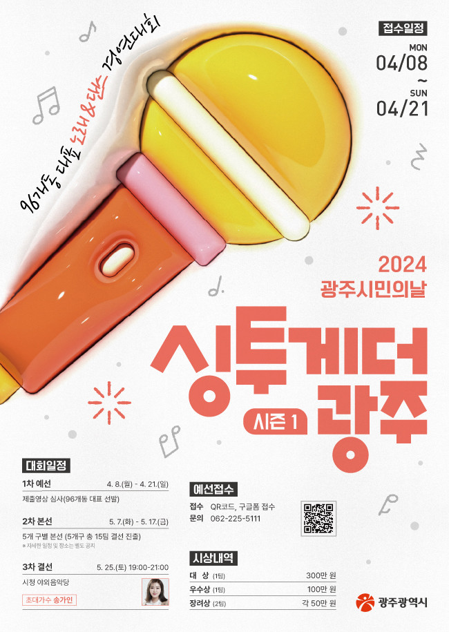 - 21일까지 접수…5월25일 결선서 4명 선발 500만원 시상 [광주 세계타임즈=손권일 기자] 광주광역시(시장 강기정)는 ‘제59회 광주 시민의 날’ 시민참여 노래&댄스 경연 프로그램 ‘싱투게더 광주 시즌1’ 참가자를 모집한다.