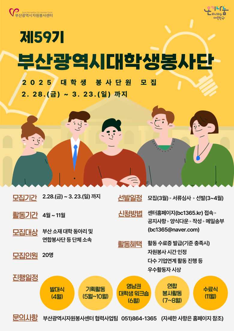 박경옥 부산광역시자원봉사센터장은 “청년들이 가진 재능과 열정이 모이면 지역사회에 더 큰 변화를 만들어낼 수 있다”며 “대학생 봉사단이 자신만의 방식으로 지역의 문제를 발견하고 해결해 나가며 더불어 성장하는 경험이 되길 바란다”고 밝혔다.