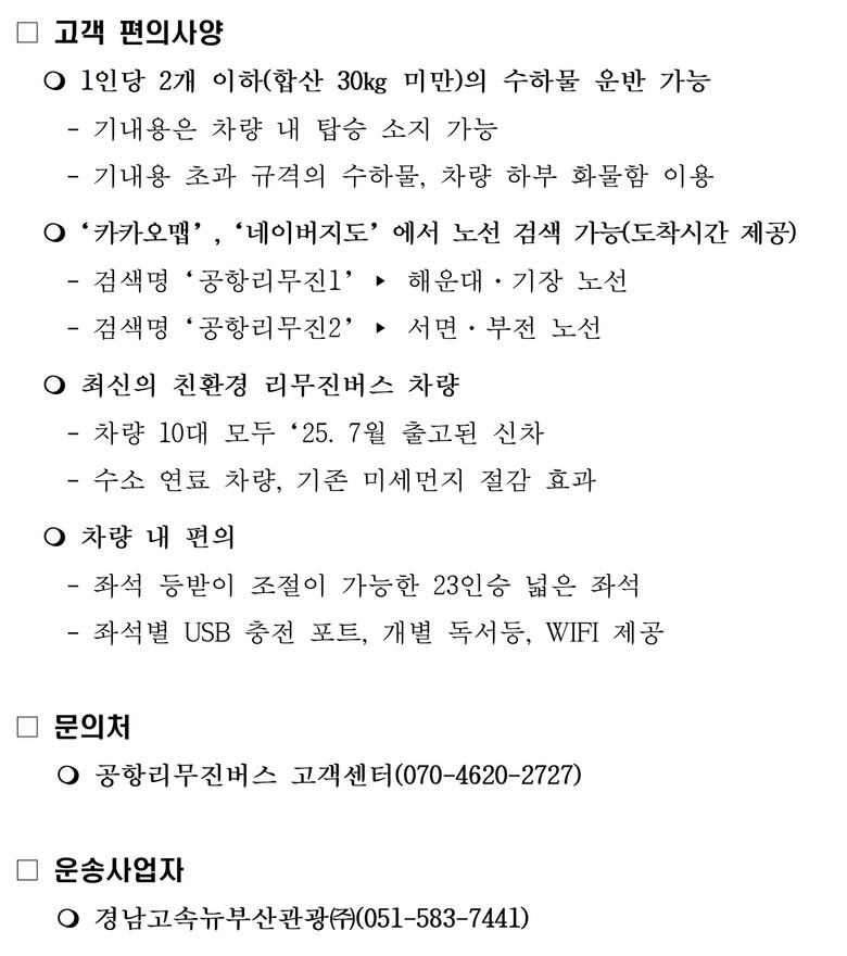 또, 여객 1인당 2개 이하(합산 30㎏ 미만)까지 별도 추가 요금 없이 수하물을 실을 수 있어, 수하물로 인해 시내버스를 이용하지 못했던 승객들의 불편을 해소할 수 있게 됐다.