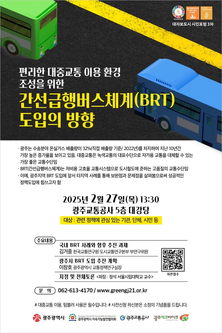 이날 포럼에서는 서울·세종·부산 등 국내 BRT 도입과 운영 사례를 살펴보고 전문가와 시민의 의견을 듣는다. 광주시는 포럼에서 제시된 정책적 제언을 광주시 교통정책 수립에 참고할 계획이다.