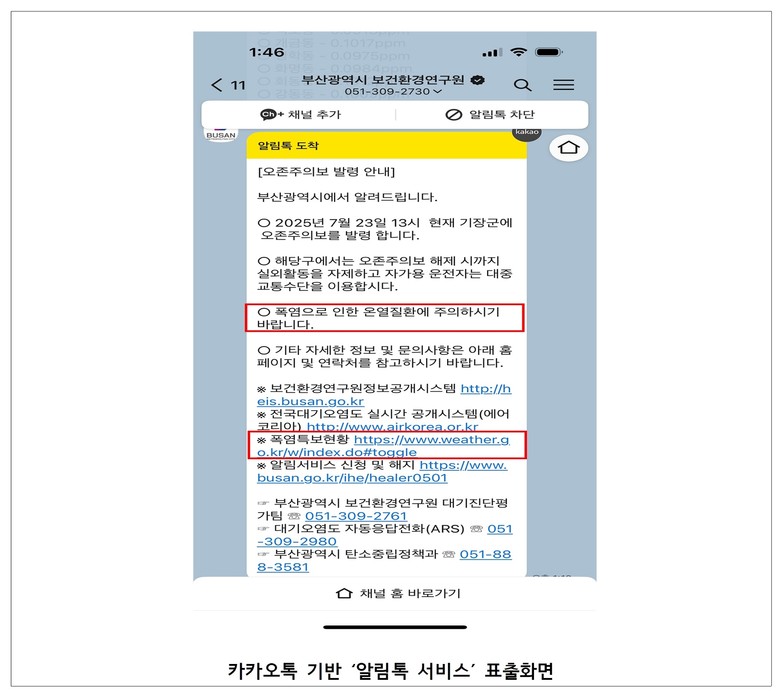한편, 폭염정보 알림 서비스를 편리하게 받아볼 수 있는 '알림톡 서비스'는 연구원 누리집(busan.go.kr/ihe>열린마당>대기오염예보 알림서비스)이나 전화(☎ 051-309-2759)로 신청할 수 있다.