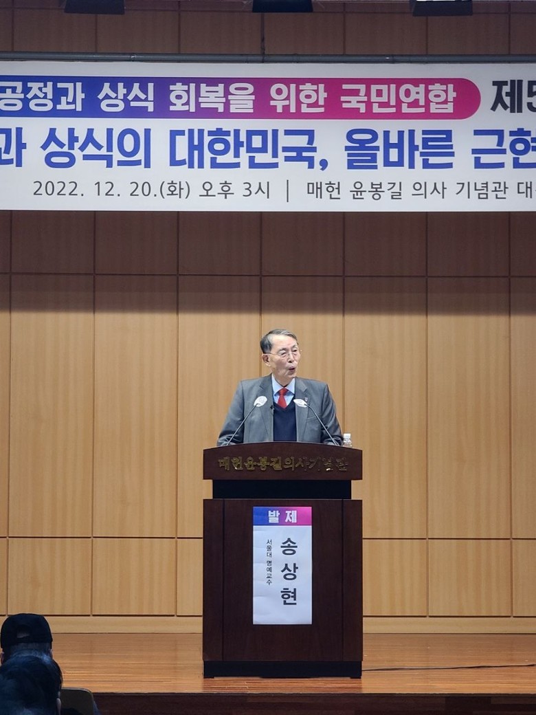 송상현 명예교수는 “공정과 상식의 회복을 위한 국민연합은 그간 정기적인 포럼을 통해 나라를 위하여 나라가 나아갈 방향을 차원높게 제시하면서 공정과 상식이 실종된 사회에서 그동안 철저하게 무너진 원칙들을 하나하나 바로 잡는데 기여하며 척박하고 흉년이 든 한국정치에 금비 대신 퇴비를 주려고 애쓰는 쉽지 않은 사명을 열심히 수행해오고 있다”고 치하한 후 현재 국내외 질서와 현황에 관한 관찰과 이러한 관찰과 분석을 통하여 장래 역사바로세우기의 필요성에 대해 강연했다.