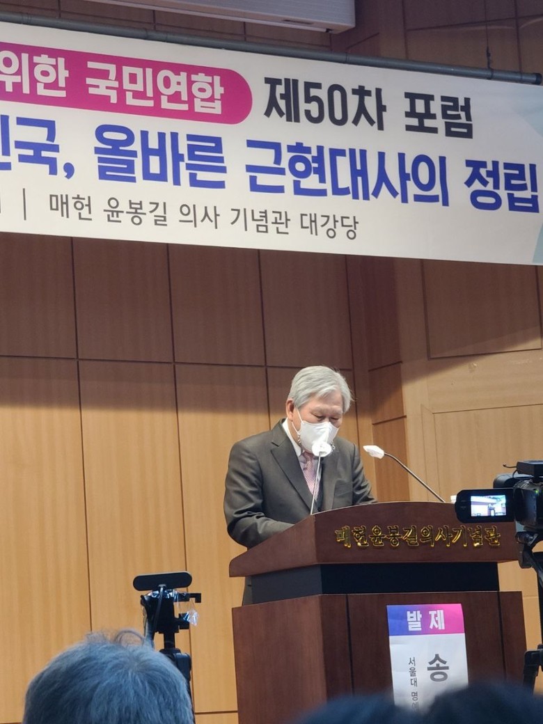 [세계타임즈 백진욱 기자] 지난 20일 오후 3시 《공정과 상식 회복을 위한 국민연합》이 “공정과 상식의 대한민국, 올바른 근현대사의 정립”를 주제로 송상현 서울대학교 명예교수(전 국제형사재판소소장)를 초청하여 매헌윤봉길의사기념관에서 제50차 포럼을 개최했다.