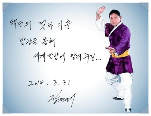 용인대학교 장경태교수가 택견을 시연하는 모습이며 전통무예 택견공연단체 발광팀에게 선전하라는 내용을 담고 있다.