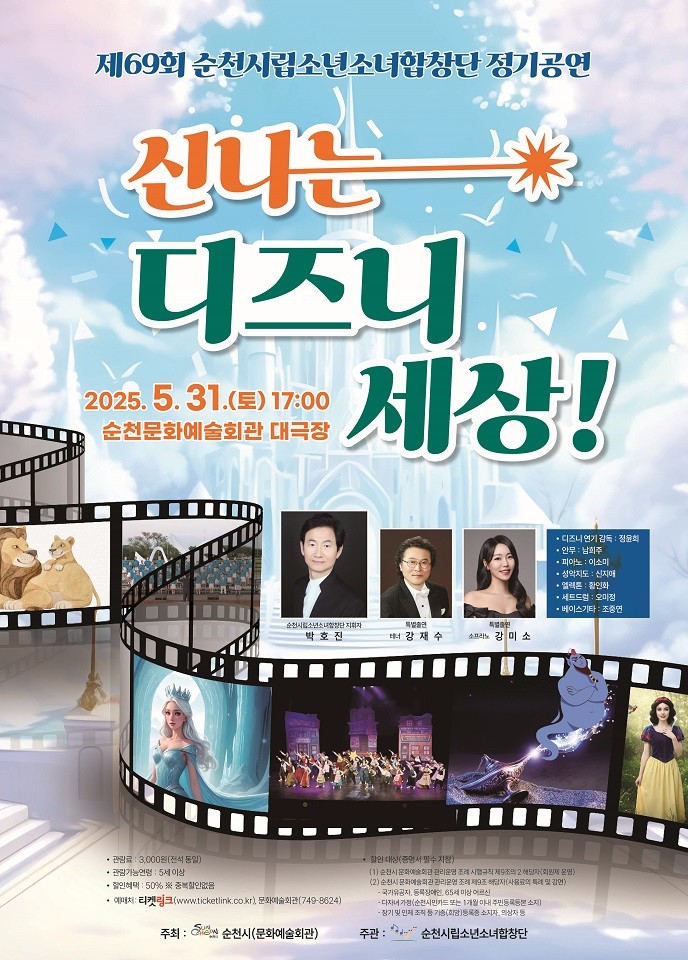 공연은 순천시립소년소녀합창단(지휘 박호진)이 <꿈꾸는 사람>, <함께> 등의 합창곡과 ‘백설공주’, ‘피노키오’ 등 디즈니 애니메이션의 수록곡들을 뮤지컬로 만들어 생동감 넘치는 화음으로 들려줄 계획이며, 지역 출신 성악가 테너 강재수와 소프라노 강미소가 특별 출연해 클래식 무대 선사로 공연의 깊이와 풍성함을 더할 예정이다.