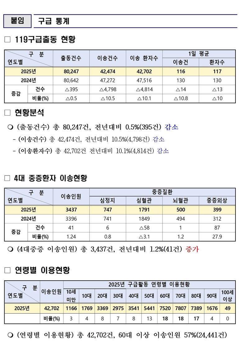 유형별로는 ▲심정지 747명 ▲심혈관질환 1,791명 ▲뇌혈관질환 500명 ▲중증외상 399명으로 집계됐다. 이는 전체 이송환자 수가 감소한 상황에서도, 생명과 직결되는 중증환자에 대한 대응은 오히려 강화되고 있음을 보여주는 지표로 분석된다.
