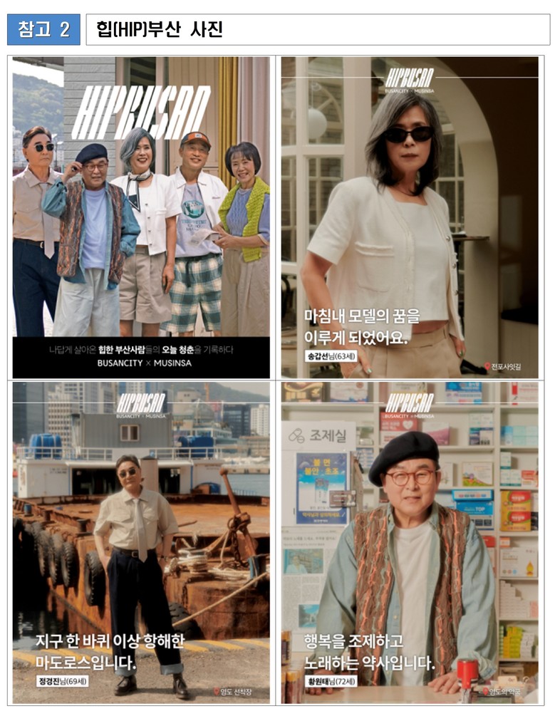 온라인 패션 플랫폼 ‘무신사’와 협업해 제작한 부산 어르신(시니어)들의 힙한 변화를 담은 콘텐츠는 총 400만 회 조회를 기록했으며, ‘무신사 매거진’에도 게재돼 젊은 세대와의 접점을 넓혔다.