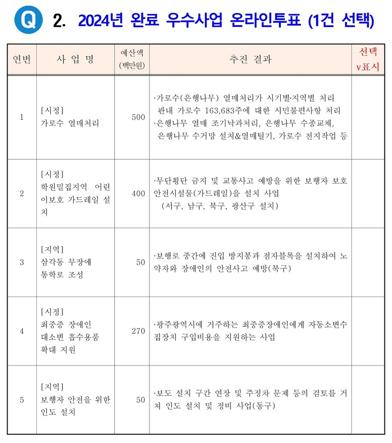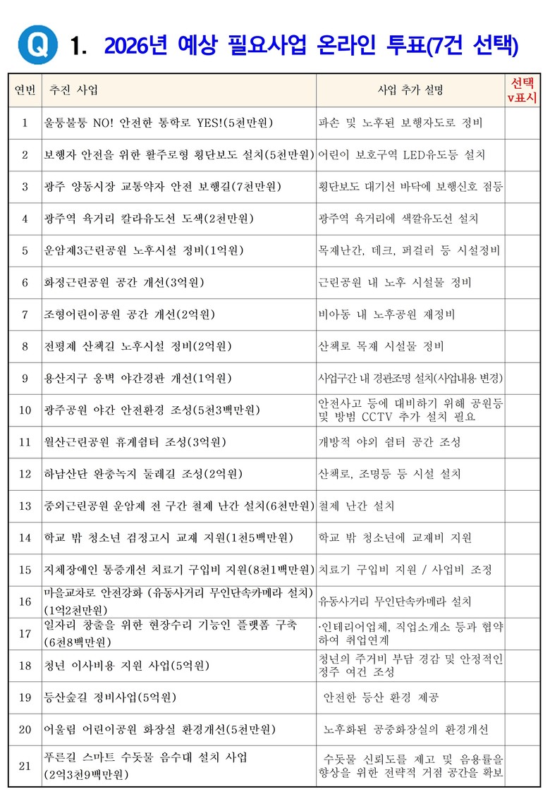 투표에 참여하는 시민은 2026년 예산에 반영할 필요사업을 선택하고, 동시에 2024년도 완료사업 중 1건을 우수사업으로 뽑으면 된다. 광주시민이라면 누구나 투표에 참여할 수 있다.
