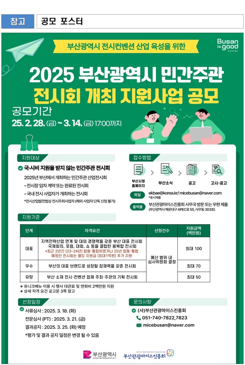 <2025년 민간주관 전시회 개최 지원사업 신청 개요> - (신청 자격) ‘25년 부산 개최 전시회로 임차계약 또는 예약이 완료된 산업전시회 - (접수 기간) ‘25. 2. 28(금) ~ 3. 14(금) 17:00까지 - (접수 방법) 전자우편(ekbae@korea.kr, micebusan@naver.com)과 출력물 동시 제출 ※ 제출처 : 부산광역시 해운대구 APEC로 55, 벡스코 사무동 303호 부산관광마이스진흥회 (☎ 051-740-7823) |