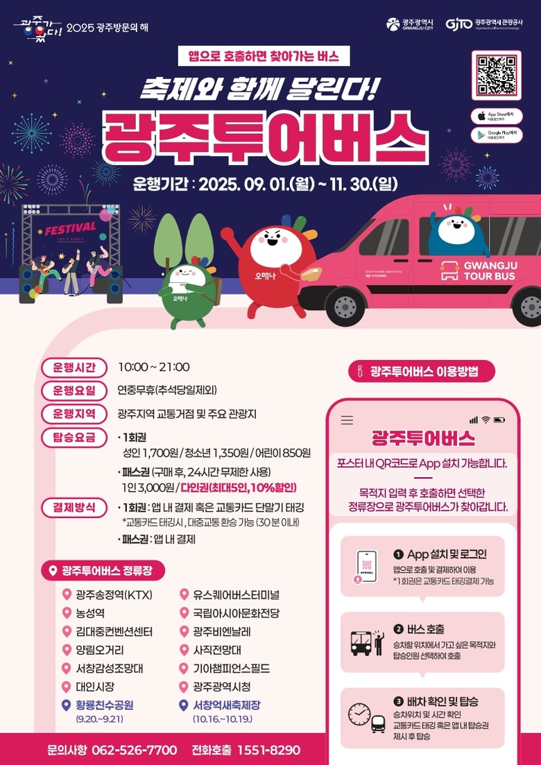 광주투어버스는 오는 11월 30일까지 매일 오전 10시부터 오후 9시까지 운행된다. 요금은 성인 기준 1회 1700원이며, 24시간 무제한 이용 가능한 1인 패스권(3000원)과 다인 패스권(최대 5인·10% 할인)이 있다.