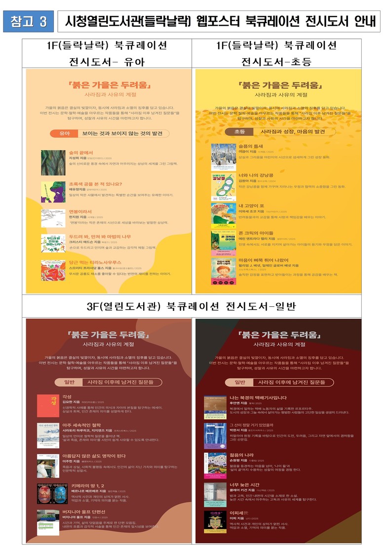 일반인 대상 전시(3층 도서관)는 「사라짐 이후 남겨진 질문들」을 주제로 가을의 붉음을 결실과 성숙의 빛깔이자 동시에 사라짐과 소멸의 정취로 해석하며, 삶과 존재, 상실과 죽음에 대한 성찰의 기회를 제공한다. 또한, 전시 기간에 ‘지극히 철학적인 코너 - 철학 카페, 북토크’ 등을 운영하여, 시민들이 책을 매개로 서로의 생각을 나누고 삶의 의미를 재해석하는 강연과 대화, 토론이 어우러진 참여형 문화 경험을 제공한다.