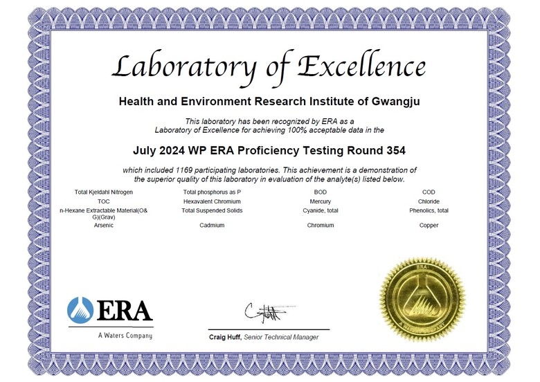 광주보건환경연구원은 지난 2015년부터 해마다 이 평가에 참여, 9년 연속 ‘최우수 분석기관’ 인증을 획득했다. 이는 광주보건환경연구원의 분석 능력이 국제 기준에 부합하며, 신뢰성 있는 분석 결과를 지속적으로 제공하고 있음을 보여주는 성과이다.