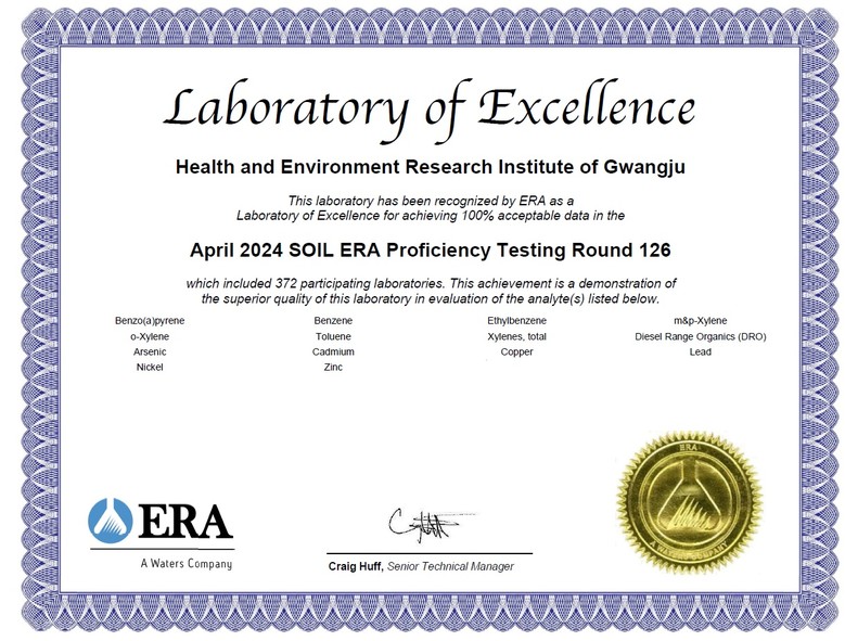 광주보건환경연구원은 수질 21개 항목과 토양 12개 항목을 포함한 총 33개 항목에서 모두 최고 등급인 ‘만족(Satisfactory)’ 평가를 획득했다.