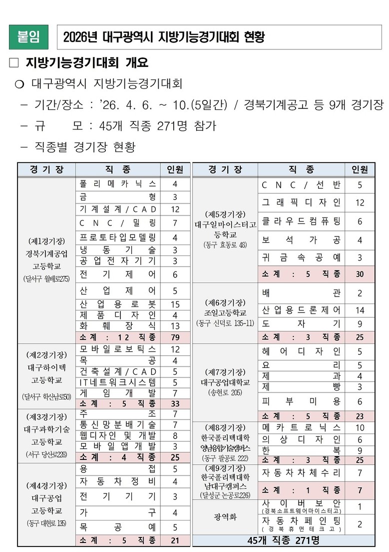 대구광역시가 주최하고 대구광역시 기능경기위원회(한국산업인력공단 대구지역본부)가 주관하는 이번 대회는 경북기계공업고등학교 등 9개 경기장에서 진행된다. 올해는 45개 직종에 총 271명의 선수가 출전해 그동안 갈고닦은 기량을 겨룰 예정이다.