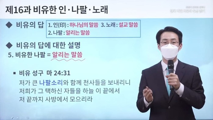 그때 인자의 징조가 하늘에서 보인다라고 한다. 그리고 저가 큰 나팔 소리와 함께 천사들을 보내리니 그 택하신 자들을 하늘 이 끝에서 저 끝까지 사방에서 모은다라고 예언한다.