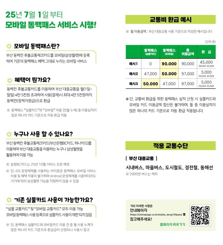 부산시(시장 박형준)는 시민들에게 더욱 편리한 대중교통 환급 혜택을 제공하고, 대중교통 이용을 활성화하기 위해 오는 7월 1일부터 「모바일 동백패스」 서비스를 시행한다고 밝혔다.