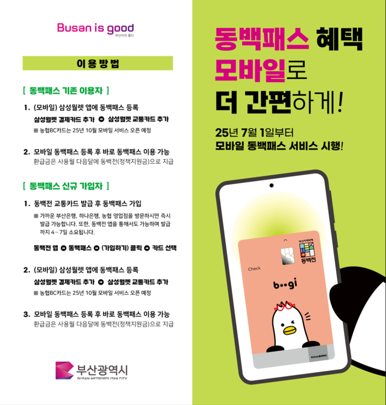 「모바일 동백패스」는 부산 동백전 후불교통 체크카드를 모바일 삼성월렛 앱에 등록해, 실물 카드 없이도 기존 동백패스 혜택을 동일하게 누릴 수 있는 모바일 서비스다. 이번 도입으로 이용 편의성이 향상돼 더 많은 시민이 동백패스 혜택을 누릴 것으로 기대된다.
