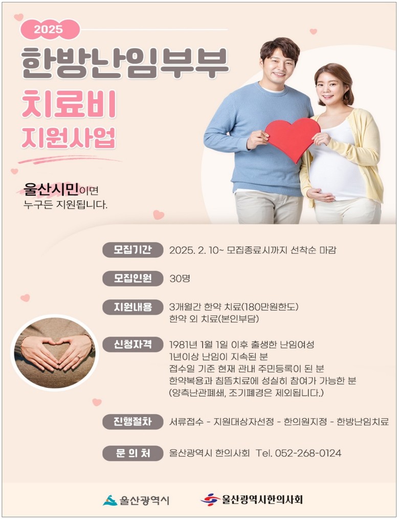 신청 방법은 울산광역시 한의사회(☎052-268-0124)로 문의 후 난임진단서, 신청서 등 관련 서류를 제출하면 된다.