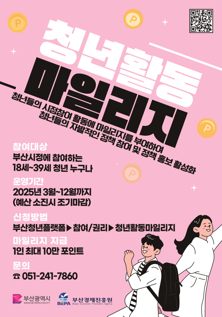 이 사업은 청년들의 자발적인 시정 참여를 유도하고, 정책 홍보를 활성화하기 위해 특·광역시 중에서는 부산이 최초로 작년부터 운영하고 있는 제도로, 활동 참여 청년들에게 마일리지를 부여하고 이를 부산 지역화폐 ‘동백전 포인트’로 지급하는 방식으로 운영된다.