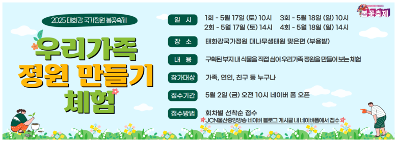 [울산 세계타임즈=이호근 기자] 울산시는 오는 5월 16일부터 18일까지 개최 예정인 ‘2025 태화강 국가정원 봄꽃축제’ 일환으로 ‘우리가족 정원 만들기 체험 행사’ 참가자를 모집한다고 밝혔다.