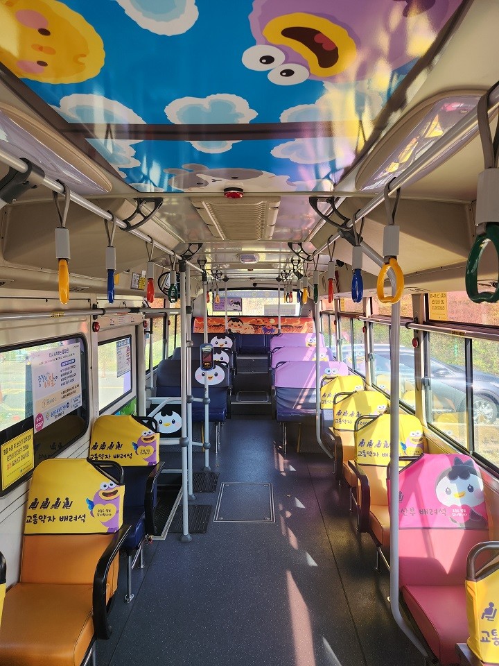 특히 천장에는 루미뚱이와 몰랑이가 탑승객을 바라보는 듯한 연출로 시각적 재미를 높였으며, 두 캐릭터를 활용한 좌석 커버 디자인도 버스 내부의 또 다른 매력적인 요소이다.