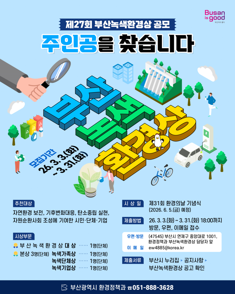 올해로 27회를 맞는 ‘부산녹색환경상’은 지역 환경분야 최고 권위의 상으로, 환경 보전과 발전에 기여한 시민·단체·기업에게 수여된다.
