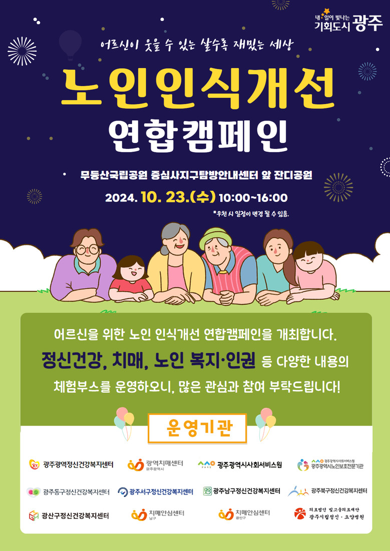 이날 캠페인은 광주시가 주최하고 광주광역정신건강복지센터, 광주광역치매센터, 광주광역시사회서비스원, 광주광역시노인보호전문기관이 주관한다. 또 5개 자치구 기초정신건강복지센터, 남구·광산구 치매안심센터, 광주시립정신병원 등 12개 기관이 참여한다.