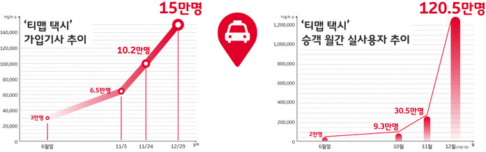 또한, ‘티맵택시’ 가입기사 수도 29일 현재 15만 명을 넘어섰다. 지난6월말 3만명 수준이었던 가입기사는 11월5일 리뉴얼 발표 당시 6만5천명, 11월24일 10만명을 기록하는 등 빠르게 늘고 있다. 이 같은 가입기사 규모는 전국 택시 기사(27만명)의 56 % 수준이다.