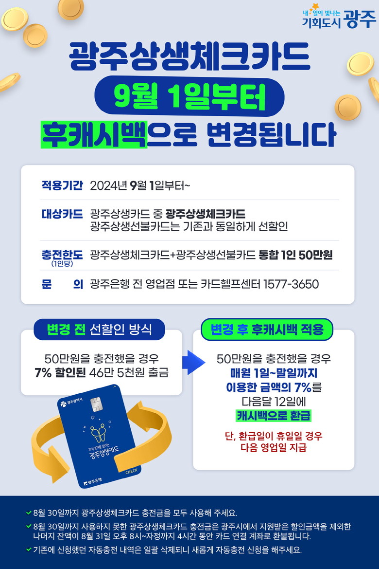 광주광역시(시장 강기정)는 광주상생체크카드의 할인지원방식이 충전금액의 7%를 할인해 주는 선 할인에서 충전금액을 사용한 후 7%를 환급(캐시백)해주는 방식으로 변경된다고 밝혔다.