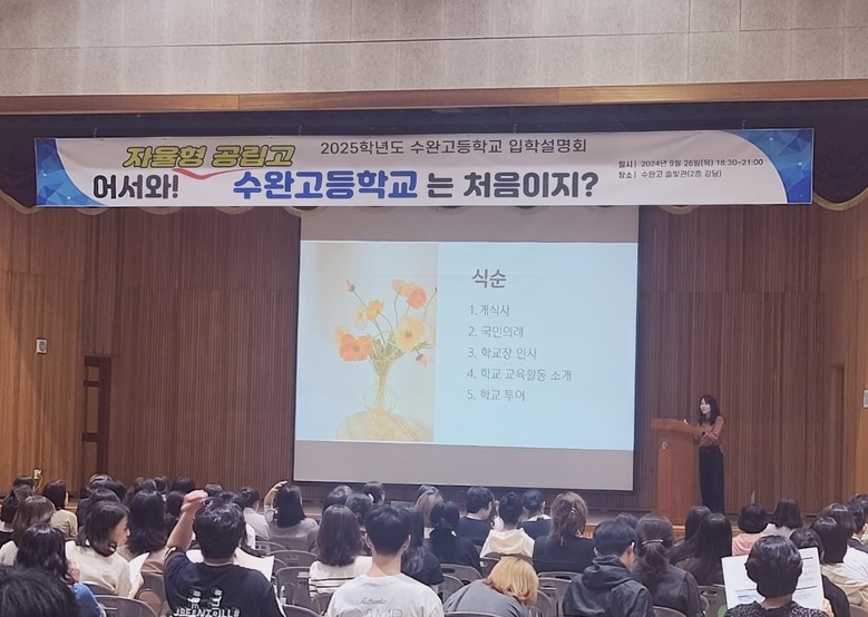 수완고등학교는 지난 2월 광산구지역 일반고등학교 중 최초로 교육부 지정 ‘자율형 공립고 2.0 학교’로 선정됐다. 이날 설명회에는 광주 전지역 33개 중학교 300여 명의 학생과 학부모가 참여하는 등 뜨거운 관심을 보였다.