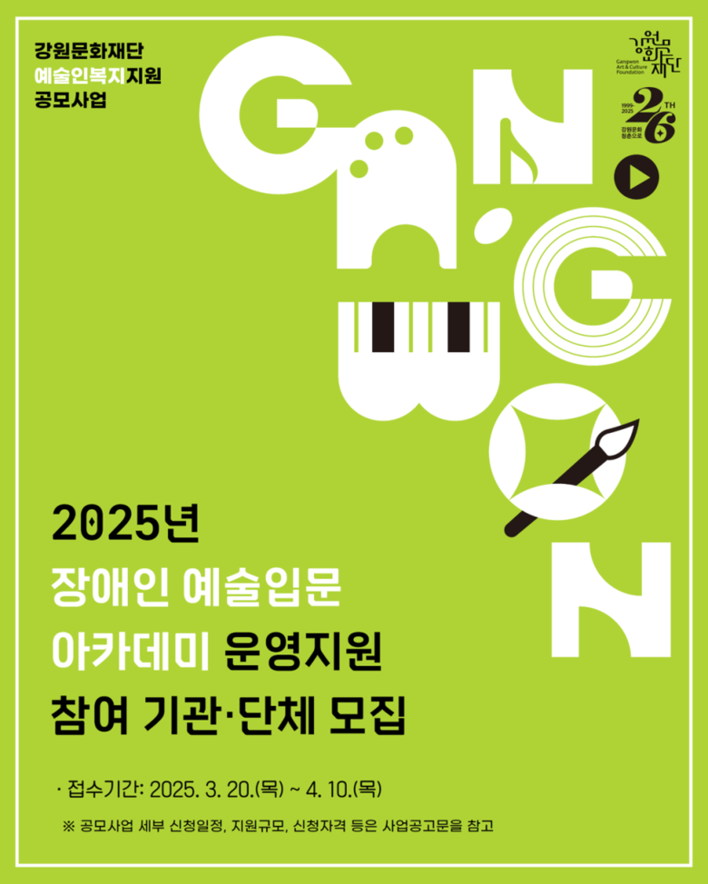·11개 예술 분야 대상, 기관·단체당 3,500만 원 정액 지원 [강원도 세계타임즈=김민석 기자] 강원문화재단(대표이사 신현상)은 오는 3월 20일부터 도내 예술 기관 및 단체를 대상으로 ‘장애인 예술입문 아카데미 운영 지원’ 공모 접수를 시작한다고 밝혔다.